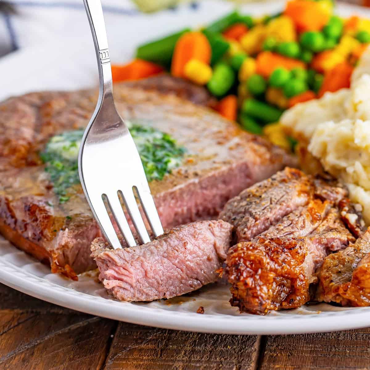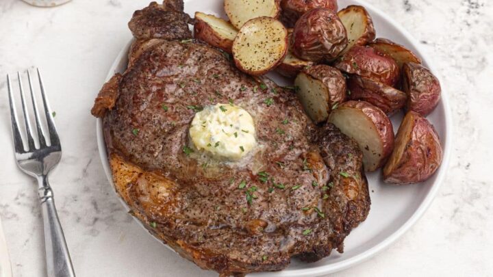 Air fryer-cooked ribeye steak is juicy and moist. Seasoned with only salt and pepper, then topped with blue cheese butter.