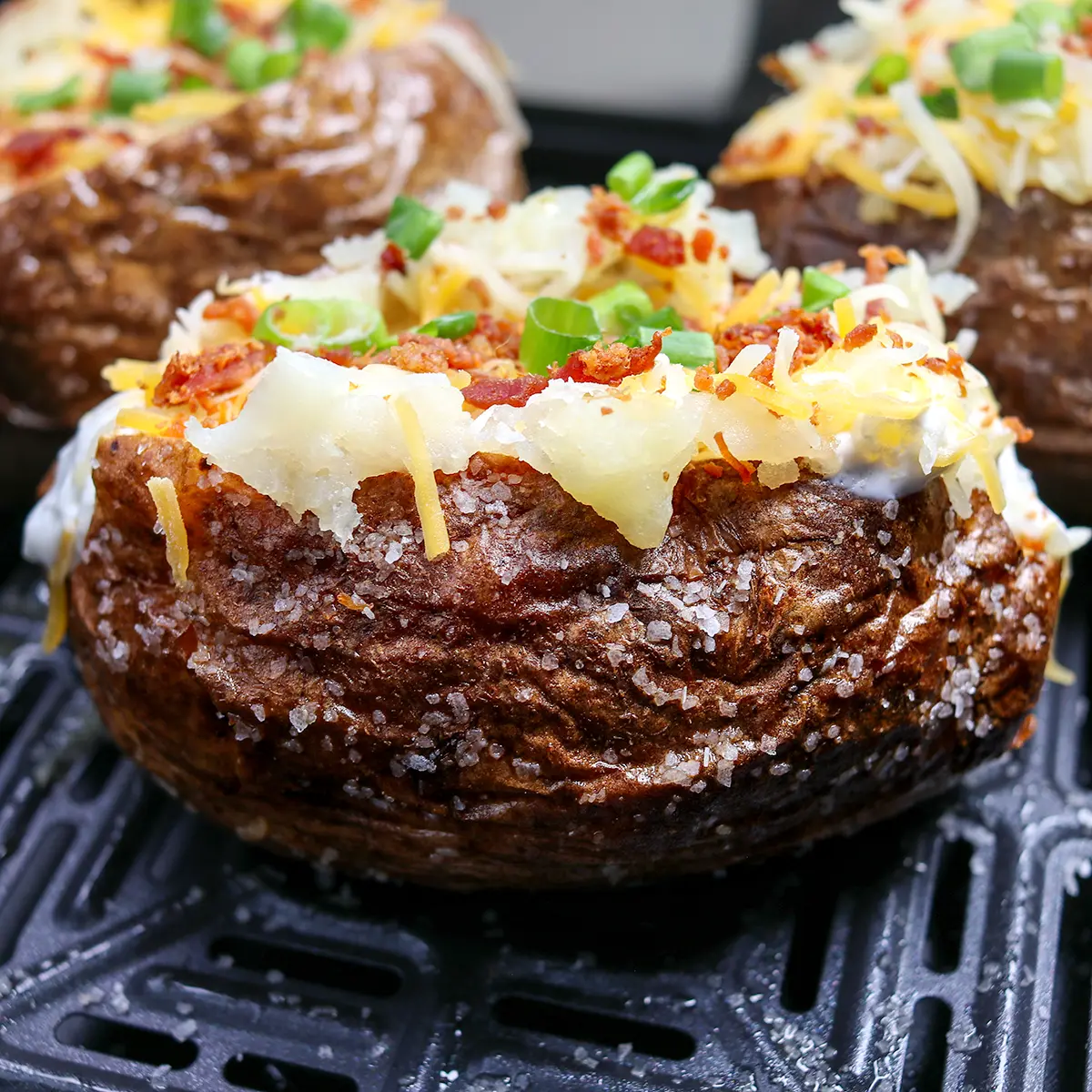 Air Fryer Loaded Baked Potatoes are crispy and salty on the outside while fluffy on the inside, just like the restaurant version! The steakhouse potatoes are stuffed with butter, sour cream, cheese, bacon, and green onions.