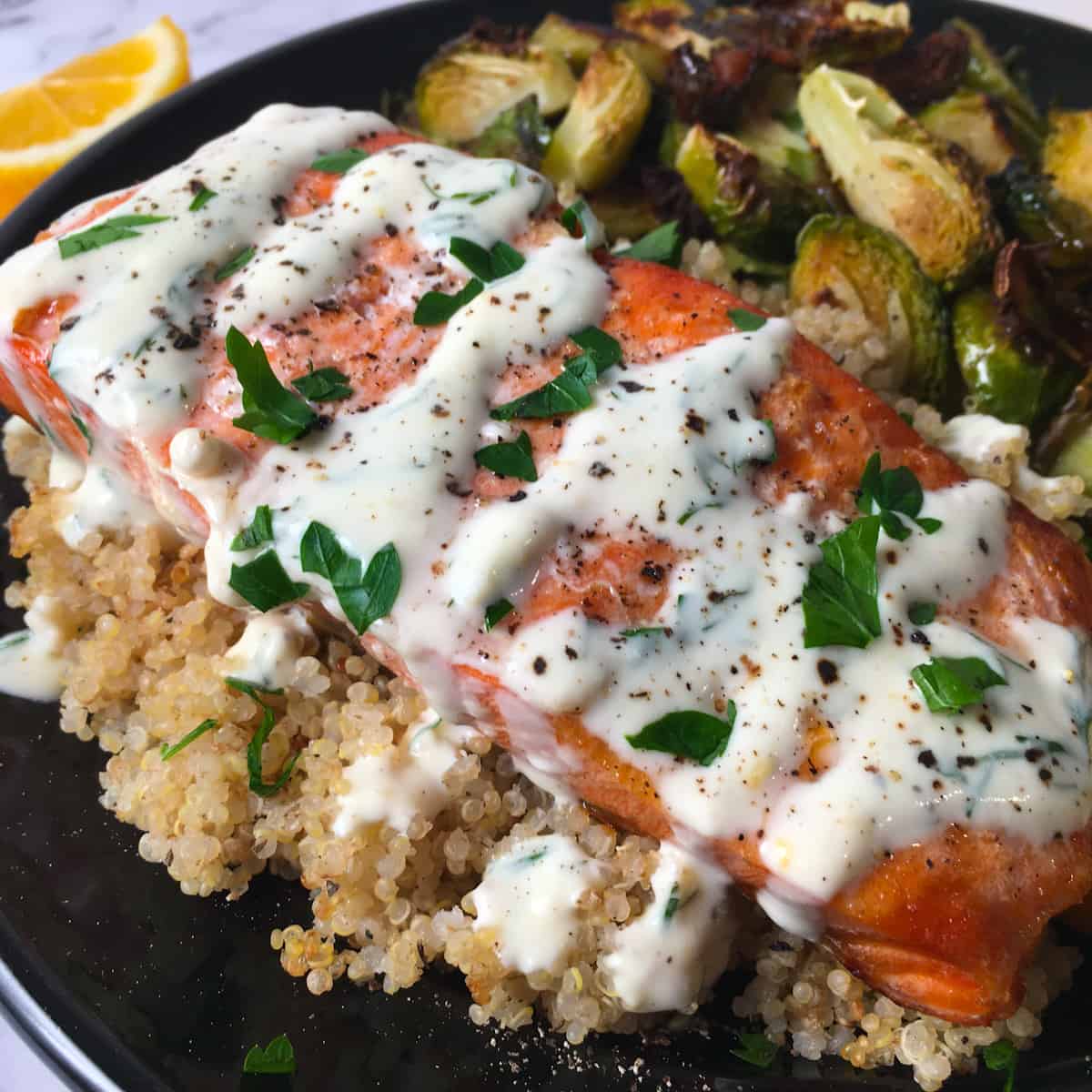 Learn how to prepare air fryer frozen salmon fillets with an indulgent lemon cream sauce that is low carb, keto, and gluten free. Only 2.2 g net carbs.