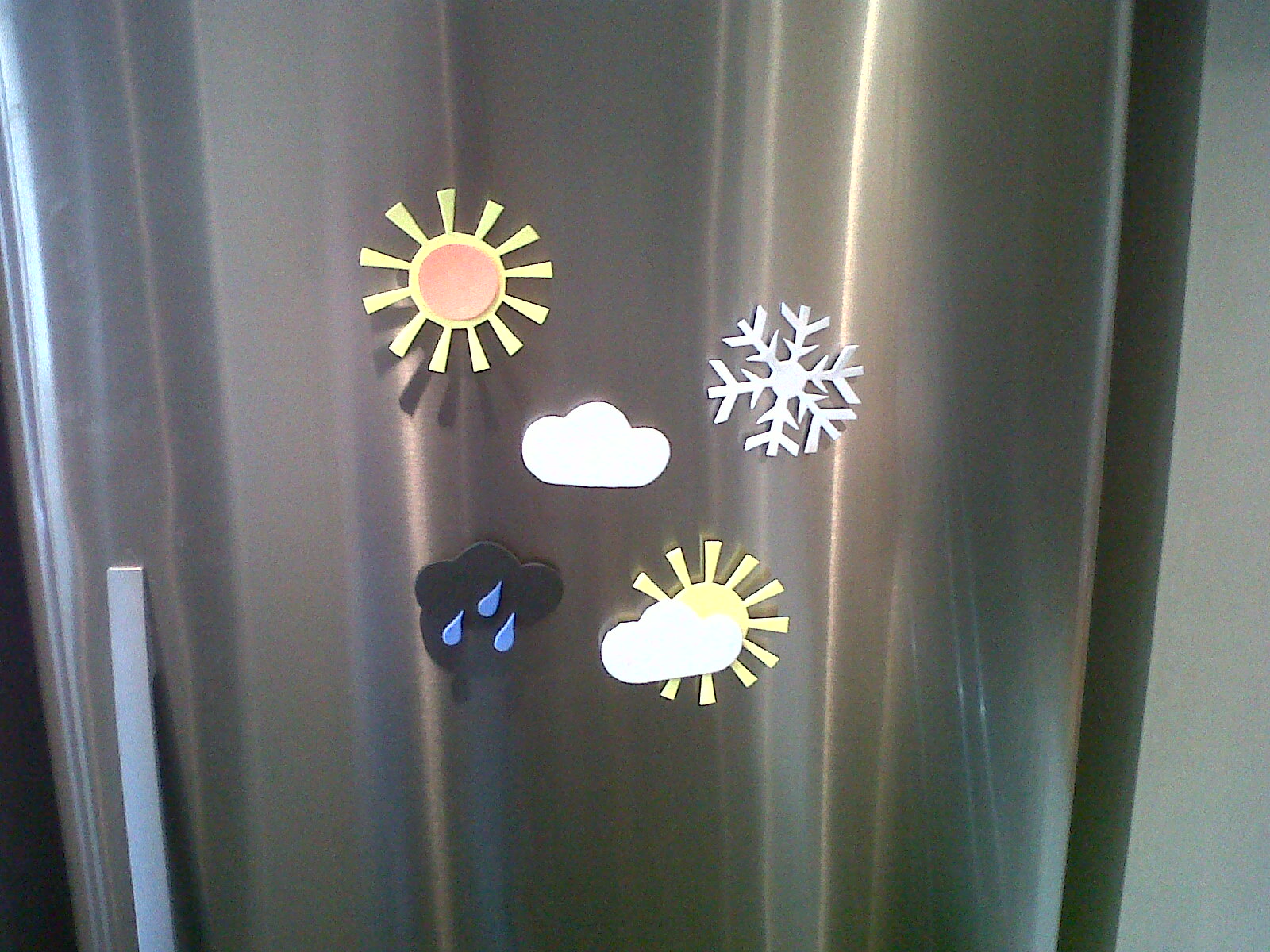 Become your very own weather presenter with these fridge magnets. Thanks for www.cutfoam.co.uk the cushion foam experts. These colourful magnets will brighten up any fridge and are great fun for the kids to make. They are very simple to make, although the snowflake is a bit harder to cut out than the others. Magnets can be bought from any craft shop.